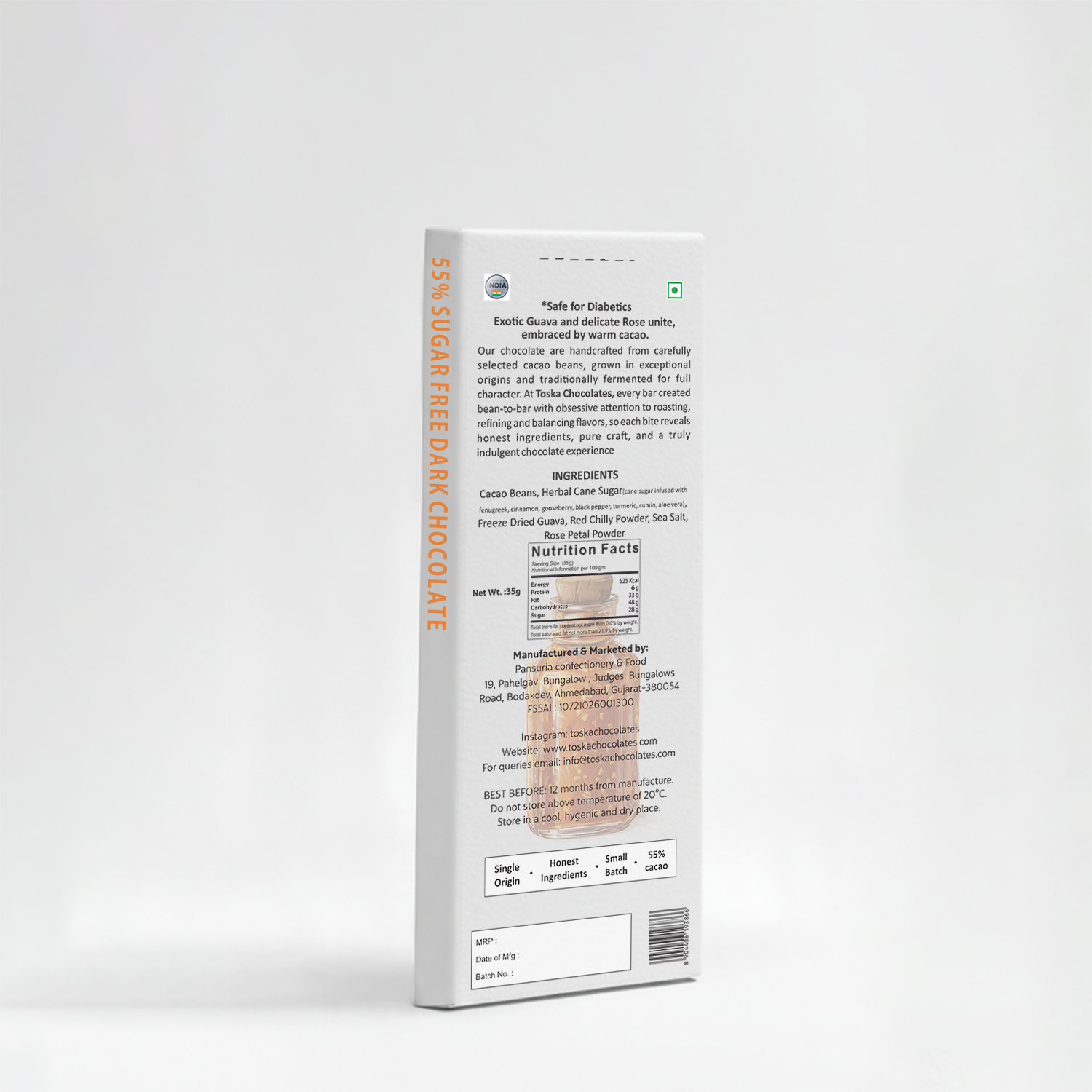 In a 55% sugar-free dark chocolate, kissed with Herbal Cane Sugar (so even diabetics can indulge), we pair bold guava with a soft hint of rose, like a sweet breeze from those endless summers.