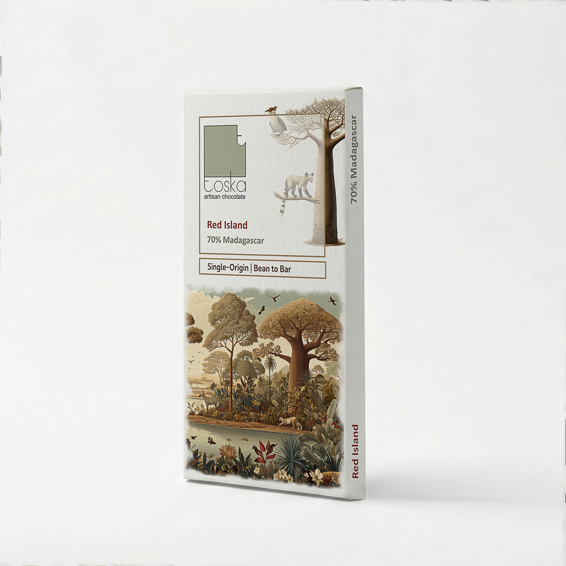 Born from the legendary cacao of Madagascar, Red Island is a celebration of purity at its most powerful. A 70% single origin dark chocolate, aged to quiet maturity, it carries the soul of the land it comes from vivid, untamed, and intensely elegant.
